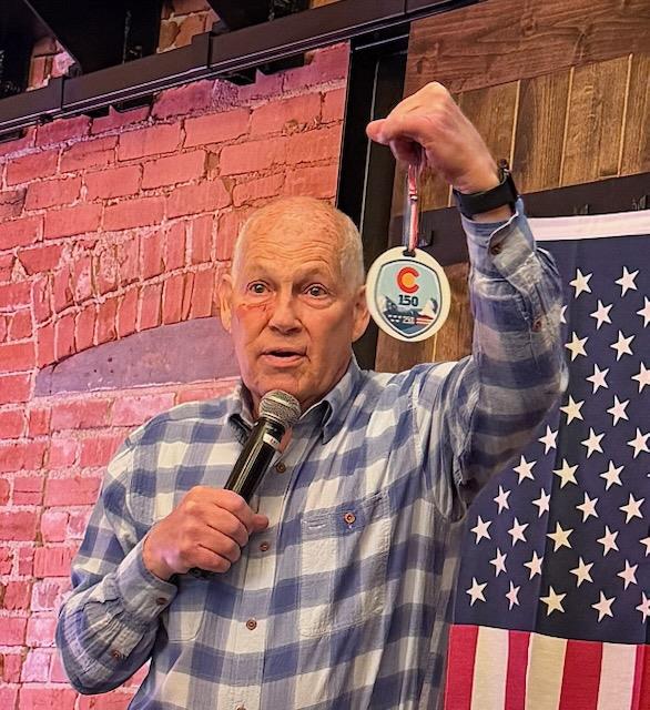 Field of Honor Co-Chair shows off the 250 America/150 Colorado anniversary medallion that will be available for the 2026 Field of Honor from May 23 to May 25 at Spring Canyon Park.
