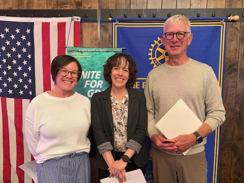 Chair John Sheltren presented the following members with their Paul Harris recognition pins from The Rotary Foundation: Sam Preuss (her first!); Connie Sheltren (her 6th) and Walt Grady (his 7th). The Rotary Foundation recognized Rotary members with a Paul Harris (Rotary's founder) with a pin for every $1000 they donated to the foundation.
