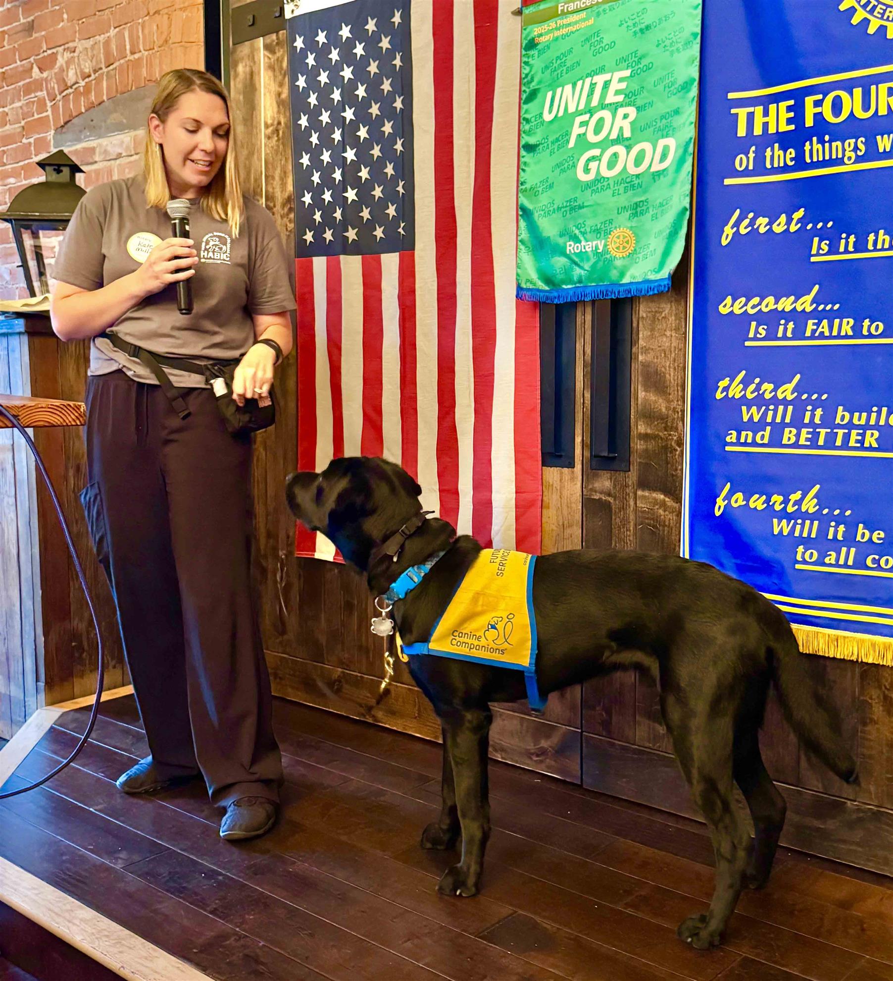 Program: Molly Skold introduced Kate Miller, Animal Trainer and Volunteer Coordinator, Human-Animal Bond in Colorado (HABIC) at CSU. - Kate introduced her companion, Leopold the Third, a mix-breed one year-old service canine in training - When Leopold is trained, he will serve people with disabilities in California - Kate shared stories about nonverbal people responding to service dogs - Service dogs can be utilized at preschools, nursing homes, birthday parties, and end of life experiences - Service dogs need to be friendly but not over friendly, unresponsive to loud noises or someone stepping on their tail - Kate educates trainers in a 12-week class on how to handle service dogs - Trainers are expected to volunteer 6 times a year with a service dog - Any dog can be a service dog however Golden Retrievers are the best candidates - Cats can be more trainable than dogs with the proper positive motivation
