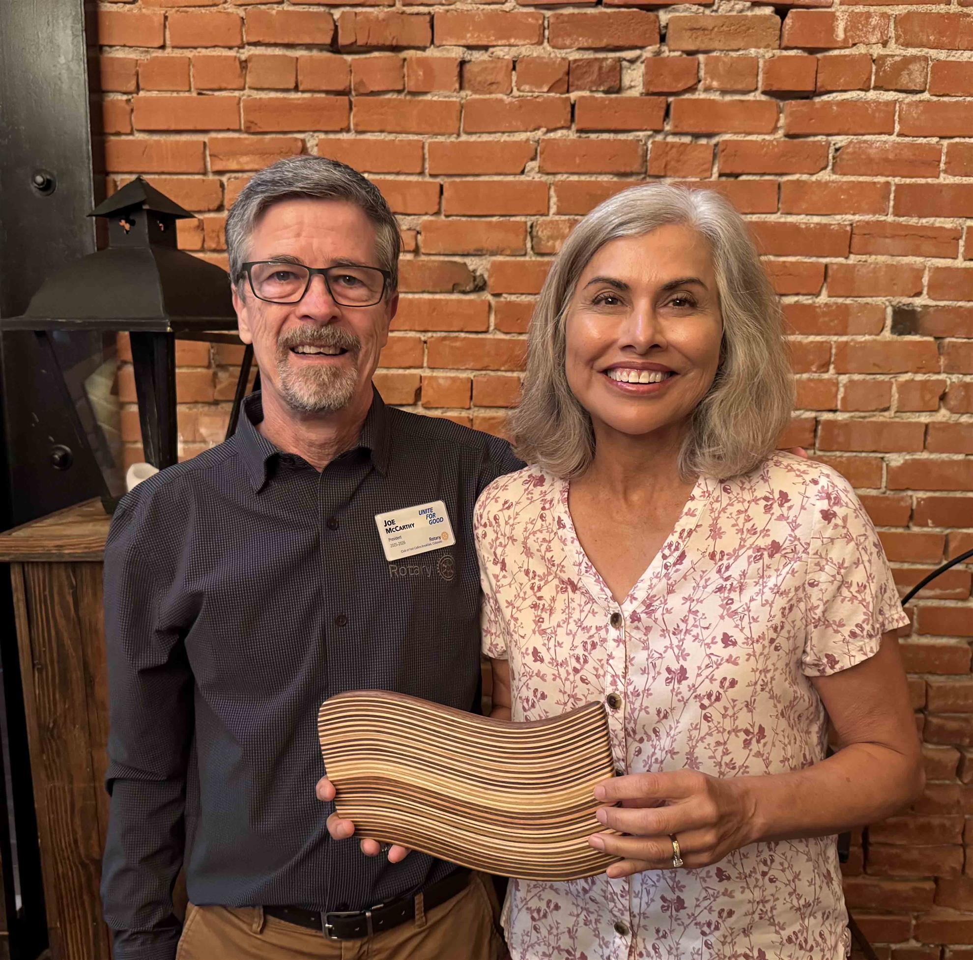 Announcements: - Dave Haase and Tony Catania reminded Rotarians to sign up for the volunteer positions on the Peach Festival email sent Monday, July 14 and for the Peach Sale volunteer positions to be sent soon. - Leighanne Alford encouraged Rotarians to share our Peach Sale club Facebook postings and this LINK with their email contacts to support the Book Trust and the Larimer County Dolly Parton Imagination Library - Joe McCarthy honored Becky de la Torre with a curved serving board for her help in getting the IDEA committee up and running, for bringing Braver Angels to our club, and for connecting our club with Mujeres de Colores. - Chuck Rutenberg said keep an eye out for an email to sign up for two volunteer opportunities at Mejeres de Colores associated with their backpack program. Mark your calendars - Saturday Aug 2nd and Saturday Aug 9th. More info to follow.